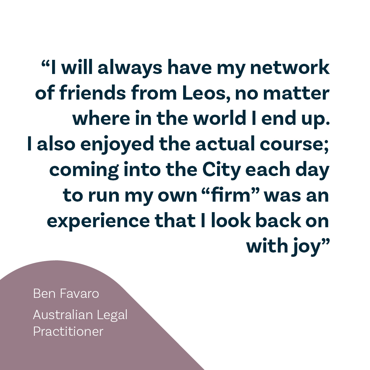 Ben reminisces on his time at Leo Cussen Centre for Law, where he explains the most valuable part was the friendships he made… “I will always have my network of friends from Leos, no matter where in the world I end up. I also enjoyed the actual course; coming into the City each day to run my own ‘firm’ was an experience that I look back on with joy.”