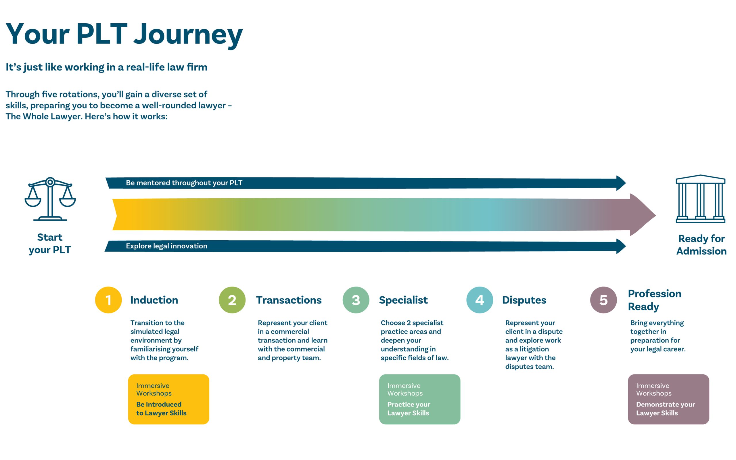 Induction: This rotation helps you transition from university to legal work. You’ll be introduced to the key skills you’ll need to develop as a new lawyer, become familiar with the course structure, the pathway to admission, and the legal profession you’re about to join.